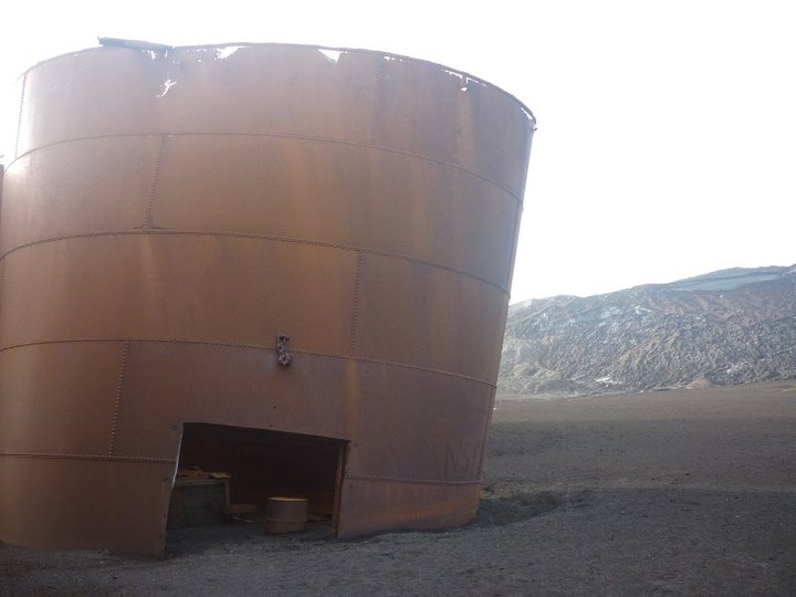 4 massive iron drums , delapidated wooden buildings left after the volcano erupted. There needs to be a clean up operation here. Although the contrast is beautful in this golden light it is not right for the environment, even if a forced evacuation was necessary. Heavy machinery and paint left around to rot, all in the name of science. Since the treaty came in there must be a responsibility for governments to take care of their impacts on the continent surely.