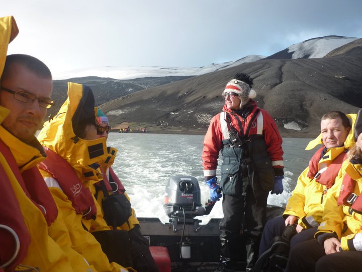 After an hour of SW course we arrive at oursecond destination and come into the bowels of Deception Island, its name given to this volcano's obscured entrance. Still active the beach is black and digging a little smells of sulphur and is warm. The beach is littered with remnants of a British base.