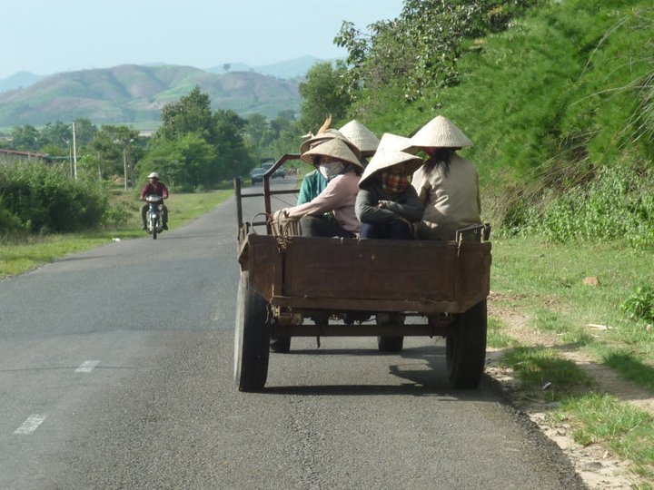 We were driving on the road to Dalat, famed for its cool beautiful mountainous landscape. Although we were about 6 hours on a bus away from Dalat, the landscape was noticeably becoming more hilly. For a few hours we enjoyed the best biking in Vietnam we had experienced. Winding through and up hills with bends that would expose fantastic views of flat padi fields below. We passed minority villages that were advertised in tour packages.