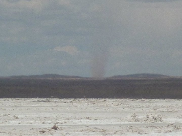 Finally we set off to the beginning of the salt flats. Volcan de Sal, an area where salt is dug from the plane into piles weighing a ton each, and left to dry in the sun before transport to a refinery then to your table. Here was were we saw our first of many dust devils, this one we managed to capture though...it proved difficult from the jeep window later on in the trip! It was a fantastic feeling to finally be on the salt flat, such a vast incredible place.
