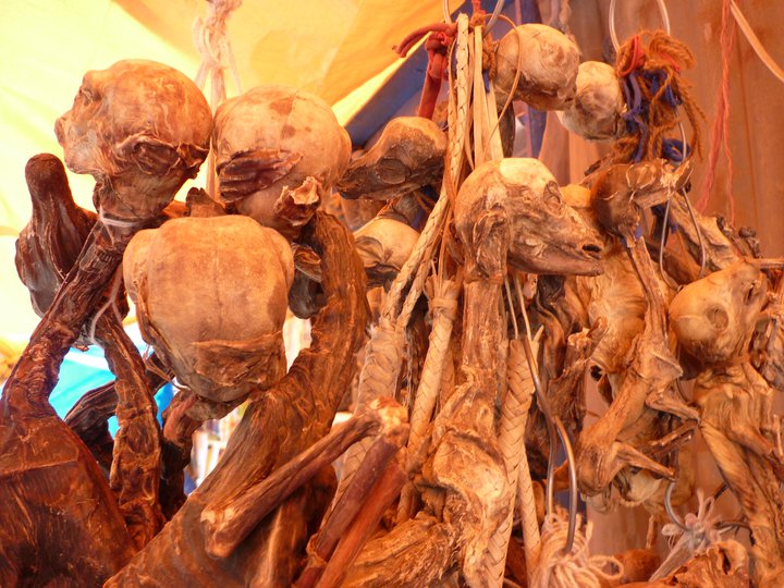 Beyond the cafe, I found the beginning of the market area of the city. It wound through cobbled streets, getting steeper and steeper. I ended up doing a huge loop through more markets and ending up back at the hostel. The markets amazed me. Not only was there absolutely anything and everything, they were organised by street. I walked down one street FULL of pipes and plumbing stuff. Stalls literally bursting at the seems with copper pipes, rubber tubing, you name it, they had it. Nearing the end of my cruise through the market streets I found the notorious witches market. The stalls were full of equipment for witch craft. This included dried Llamma foetuses, and many other unidentifiable weird objects, sweets, bottles of beer and clay blocks that carried signs to the spirits.