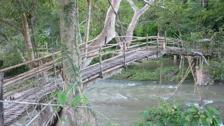 Across a well engineered bamboo bridge and the a long rope bridge part suspended, part badly supported through bamboo poles curved around a tree trunk and to the other bank, where an incredible scene and light awaited us. The low sun highlighted the