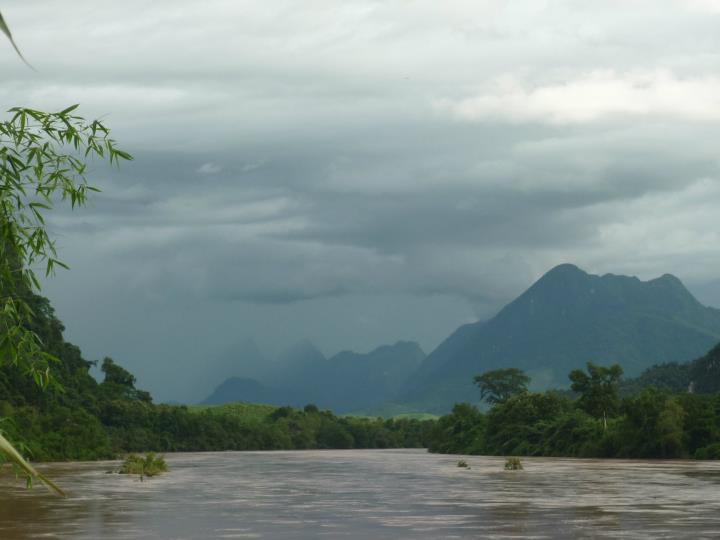 and mud adorned the outside environment as it started to spit with rain, black clouds rapidly flowing over the mountain peaks like a dolphin through water. The inside of the bungalow was well appointed as it was actually clad with plaster board, an effort usually too great for the Laotians. The bathroom was tiled and with a hammock outside on the verandah we were extremely happy. We also felt luck as our expenses were covered and so we were heading to a place that we otherwise could not have reached with our budget restrictions. We had agreed that we would really push ourselves off the beaten track and do something that challenged us to the limits and here we were, we were doing it. Anticipating excitement rushed through us as we sat taking in the scene. After a needed nap we headed over to grab something to eat from a restaurant that looked over the river and the port, which we would be stood at tomorrow to pick up a public boat to Muang Ngoi. For now however we ate well; pizza bread, noodle soup, Aurlam (a local dish made of meat, dill and wild mushrooms), fried rice and local coffee formed the veritable spread we needed with lack off food the night before and breakfast. The view was impressive as the clouds rolled in and dissipated, sun beams highlighted different parts of the landscape in ways artists dream of. The river was exceptionally high and the boats roared into life and cut across the river to begin its crawl upstream on the near side of the bank.