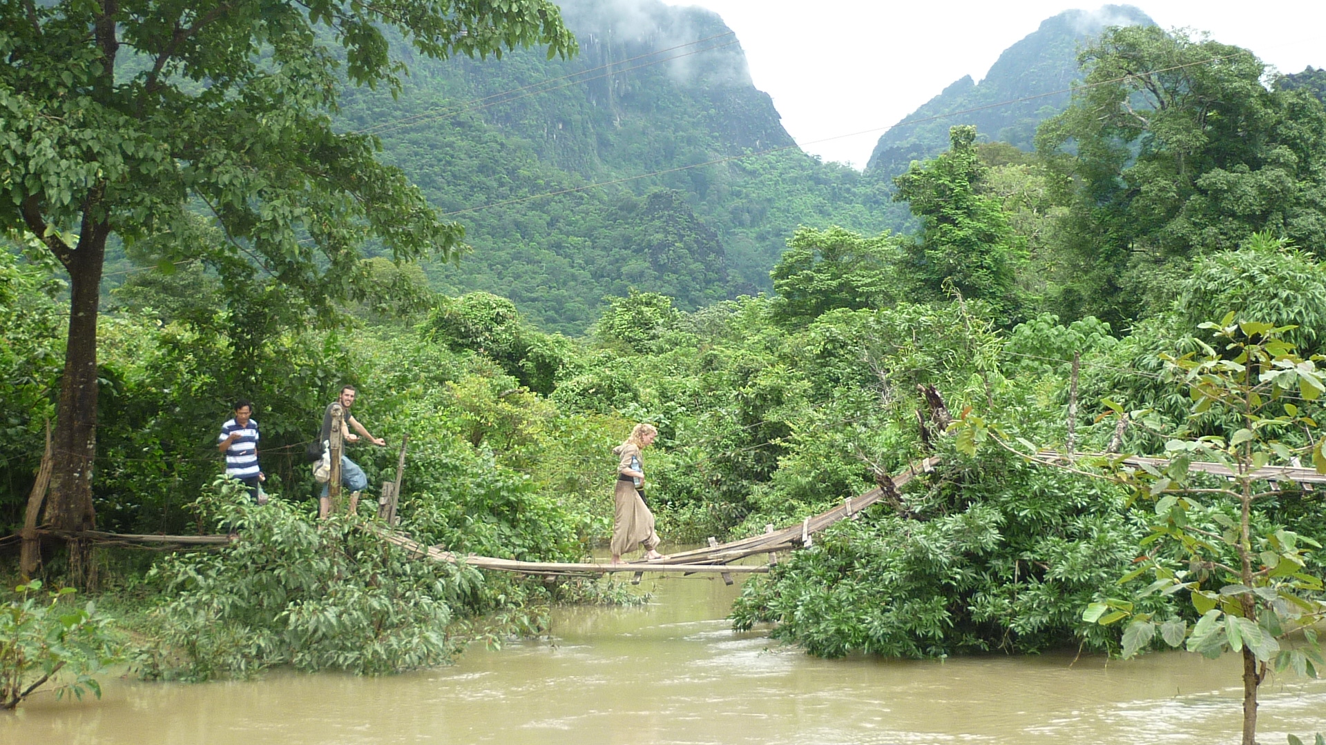 After sometime we passed through some tiny settlements with stilted houses. This time we saw the stilts in good use. the water was almost up to the window and children wer swimming and playing the paddy field. It was a delight to watch as we slowly passed. In awe of our surroundings we had settled into our journey and happy even if it did take 5hours to reach the cave. Afetr about an hours driving the driver spoke to some young local people. Although we couldn't understand them, it soon became clear that they told him that it was not possible to eve reach Kong Lo cave because the muddy dirt roads ahead were impassable. They mimed the depth of mud, coming up to the top of the bike. Our driver was adamant that he would not go a meter futher, even though we were still on tarmac and had notreaced the muddy roads. Eventually he convinced us to visit a nearby cave instead. Going wth the flow were were all ok with it, but Sean had reallly been determined to see Kong Lo needed a little persuading. The songthew stopped next to a fast flowing small river. It was not safe to walk through it as it seemed quite deep despite being very narrow. Instead the driver pointed to a ricketty old rope bridge. It almost looked more unsafe than just trying to cross the river, but with you hestitance we saw some locals cross. Do as they do in Rome, so we began to cross. The day wa turning into quite an adventure and I was pleased that getting to Kong Lo hadnot been straight forward. These experiences are he ones that I crave when I am travelling, and they always come up by chance when they are least expected!