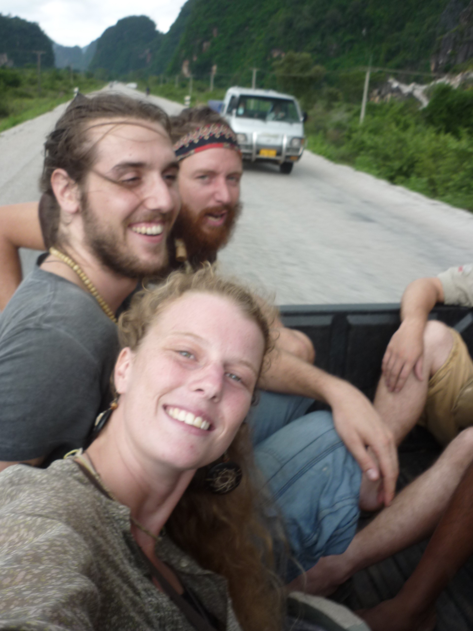 The Aussie and French guy ended up deciding that this adventure was not for them and they bailed from the songthew making it a bit more comfortable and a little easier onthe engine. Within 5 minutes after saying goodbye we experienced our first breakdown. The chain had fallen off but luckily this was easily fixable. Lorenzo and Janny (the Finnish guy) and professed their individual ambitions to do a road trip in a tuk tuk somtime in the futre, this also being an ambition of mine and Als, we all relished in this breakdown. We watched carefully enjoyed our first bit of tuk tuk 'training'! Back onthe road again we chugged on until we were out of town and enoying breathtaking scenery. Weaving and winding on smooth tarmac roads with backdrops of incredible bright green paddy fields with huge sheer rock faces jutting out of from nowhere. The vew made me think of what I always imagined a lost world to look like. With every twist and turn in the road another view would emerge keeping us entranced. Al ad I who were sitting next to the driver had the best view and we realised that this was a fantastic opportunity for making the most of Thakhek. We would not have been able to see the area if it had not been for everyone sharing the songthew with us.