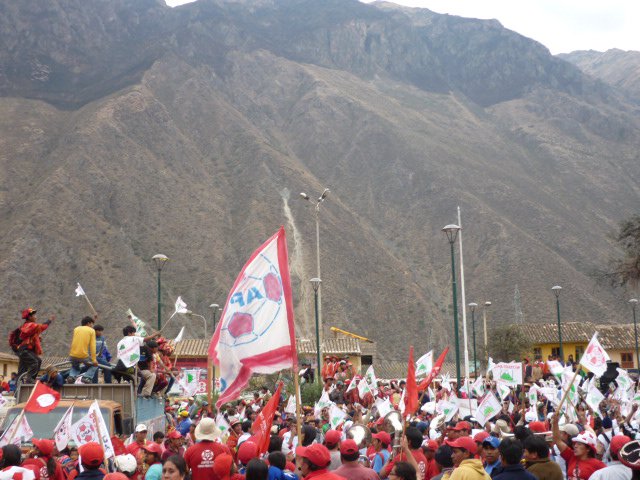 We didn't really see much more of KB after that. The following day we set about on our work, which was ultimately sitting around and telling people we were full for the next few weeks and perhaps recommending other places to stay. We strolled around the town and people watched. A mixture of locals dressed in seemingly upside down hats, and garishly bright ponchos, with tourists wearing breathable fabrics, caps and sunglasses, marching with intent and then ''modern Peruvians'' wearing scruffy trousers, strangely enough often thick sports wear and a t-shirt. The election campaigning that we had witnessed in Cuzco with the strikes, was also in full swing here. Trucks, taxis and lorries banged and rolled through the streets, kicking up dust and pumping out thick carbon smoke with supporters shouting, drumming and waving flags of their chosen party. The trouble was to decipher who they were and what they did. Each had their own icon, for example ''Pan'' (bread) party, the ''Spade'' party or the ''football'' party. This makes it easier for the locals, who are often illiterate to vote based on iconography they identify with, as we also found in India.