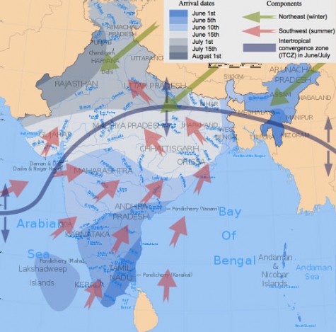 Below provides a visual map of the movement and timing of the monsoon across India.