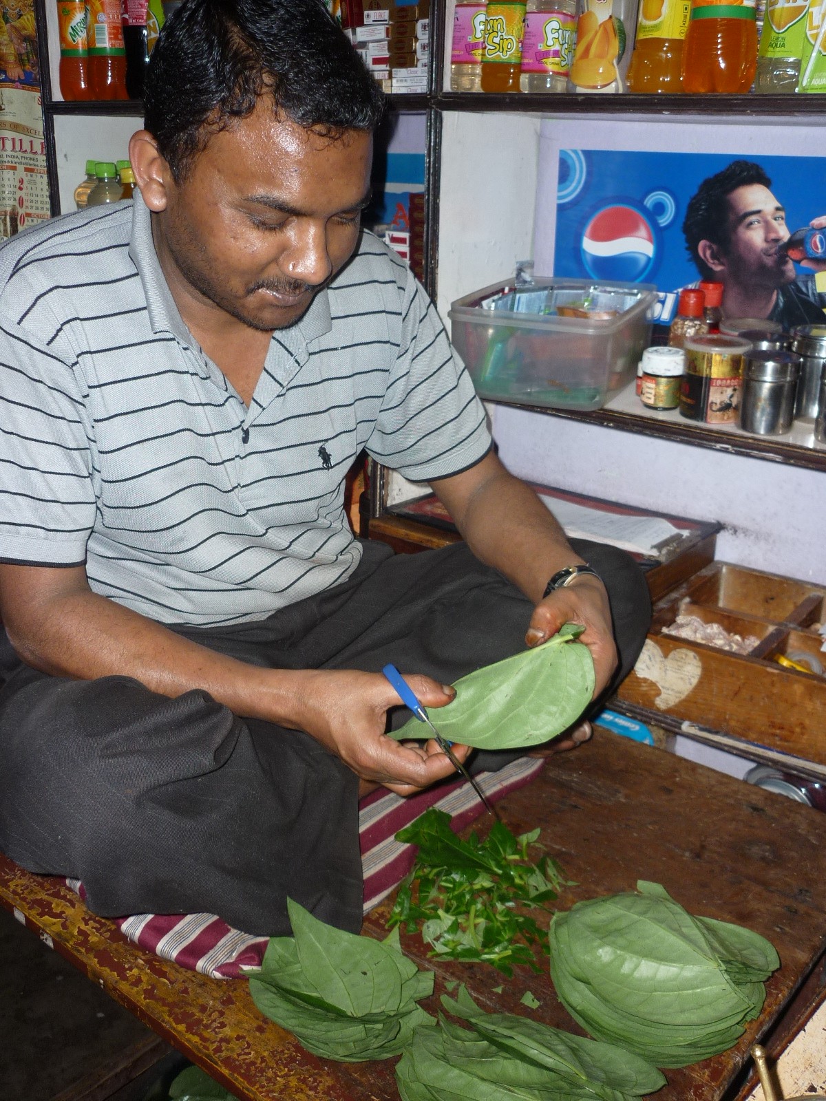 Being spat out of a shop after sitting there for hours is like being given birth to... the heat and smells hit you once more like being slapped.... in a good way! The next day we thought we would relax and catch up with ourselves. You need time to relax and take stock, sitting and observing things as they happen, for me, is the most valuable experience, as you get to pick up on things that you wouldn't otherwise see. I learnt about Paan that day and how people process Betel Nut bark to produce a highly concentrated stimulant that is rolled in a Betel Nut leaf with dried coconut, the actual Betel Nut and tobacco. This is the red substance that we now know covers the pavements and stains the rubbish bins (people spit like they would with chewing tobacco but all over the place). Apparently unscrupulous dealers are replacing the red jelly that is formed with red food colouring that is reducing the potency of the mixture, something many Paan chewers are concerned about.