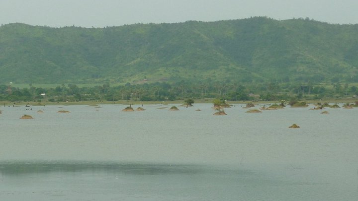 The whole area was beautiful and cutting through on our bike was such a pleasure to get a glimpse of village and country life, it seemed a world away from Kampot. On the horizon some mountains jutted up from the otherwise flat landscape. We figured that this was good news as we could see the Secret Lake was effectively in a valley between two mountains containing caves. So we continued on the same road until we were on a wide corner raising us up to get a better view of the landscape we had just been passing through. All of a sudden around the next bend the Secret Lake exposed itself. It was a large calm expanse of water only interrupted by small mounds of land that created mini islets on the surface of the water. One man bathed near the edge and another man appeared as a dot in his hollowed out canoe with a fishing net. It was truly tranquil and felt like a spiritual place. Along the edge of the road leading to the lake there were a few wooden shacks where some ladies hung out. The shacks looked like the sort that should be filled with tourist tat, but they were empty and it was clearly not the season to expect many tourists. We stopped for a Nuoc Mia (sugar cane juice) and took in the view.