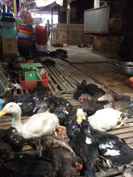This section of the market was most surreal of all. The chickens and ducks were all alive (apart from a couple of their friends who had been recently slaughtered). The sat there in silence with their feet bound together looking rather miserable. Now and then a lady would grab one of them and kill it in front of the rest. She would kill it swiftly and there would be no more than a single squawk. Opposite the chicken stand we went to I noticed a girl having a pedicure on the side of the sludgy path watching the vendors. A bizarre place.