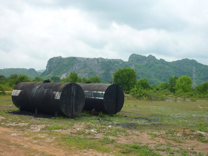The area was quite barron with only concrete rubble remaining but with the back drop of a mountainous rock jutting out of the flat land. The only sign of a factory was two old oil drums.