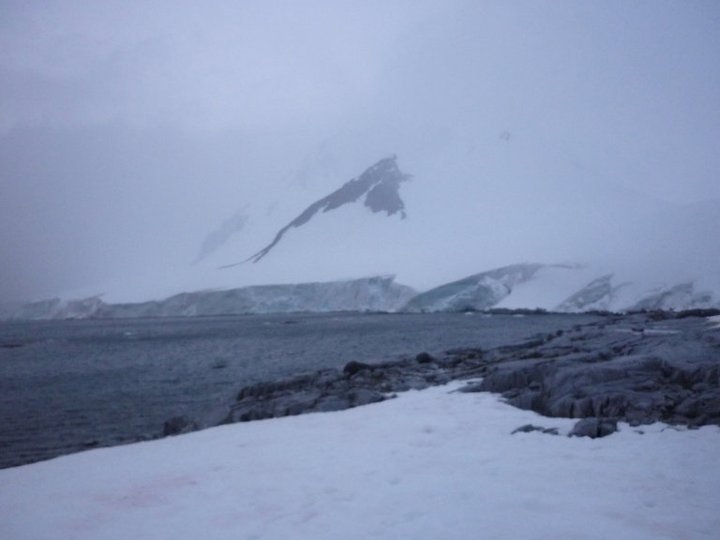 It is snowing outside and landing was at Port Charcot on Booth Island. This is a charcoal grey island made from beautiful granite, just off the Antarctic Peninsula. We land on the rocks that meet the sea, white streaks and white snow coming in from the west provides a beautiful contrast of shades that I have never experienced before. The landscape is devoid of colour, just grey sky with blowing dull fog and low cloud, the dark grey rock and white snow. Well that is not strictly true as the gentoo penguins have their dots of red beaks and spread out on the landscape were the passenger's yellow jackets speckled across the island. Snow algae provides patches of pink tinges to the ground near the shoreline. The colour as you can see all comes from life on Antarctica, feeding off the land in some way or another, existing in stark contrast to the black and white land of this desolate continent.