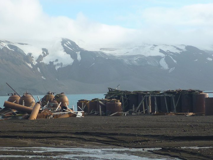 4 massive iron drums , delapidated wooden buildings left after the volcano erupted. There needs to be a clean up operation here. Although the contrast is beautful in this golden light it is not right for the environment, even if a forced evacuation was necessary. Heavy machinery and paint left around to rot, all in the name of science. Since the treaty came in there must be a responsibility for governments to take care of their impacts on the continent surely.