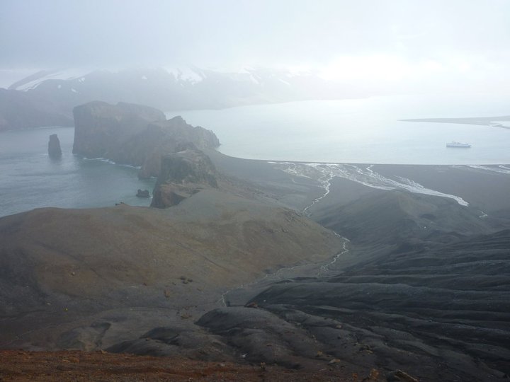 After an hour of SW course we arrive at oursecond destination and come into the bowels of Deception Island, its name given to this volcano's obscured entrance. Still active the beach is black and digging a little smells of sulphur and is warm. The beach is littered with remnants of a British base.