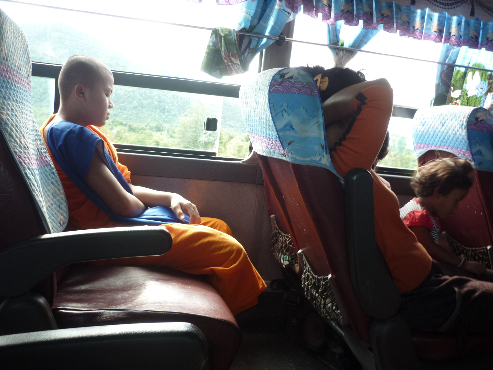 Pakse we bought bread and iced coffee in a bag. We opted for the very back seats on our final bus. Before the bus even departed the music was blaring and kareoke videos were in full swing. The bus drivers assistant fancied himself as a DJ and kept changing the videos and music around. It was impossible to escape the noise as the bus was installed with several speakers. The wiring for the speakers nearest the back (and us) were visable and Al ended up giving into temptation by pulling the wires out. A young monk directly next to the speaker looked relieved and glanced at Al gratefully.