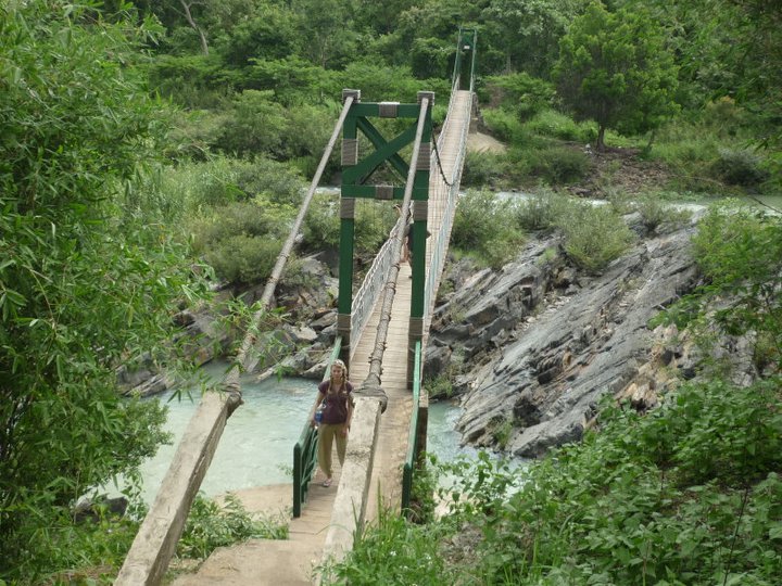 Before long we surprised ourselves and arrived at the entrance to the waterfall park. We paid a small entrance fee, 15000dong (50p) and rode into park our bike and parked up near an almost deserted looking gift shop. There were signs to the waterfalls in two directions, both on little hiking routes. We opted for the one going downhill towards the water. The park was beautiful and rich in flora and fauna. We had to wade through little flooded paths before we arrived at an opening to the river. A high, narrow rope suspended bridge connected the riversides. Many Vietnamese men were jumping off the bridge from huge height and plunging into the cold looking river below. Impossible to see the river bottom, we didn't fancy our chances. I had read about sharp igneous rocks below the surface that made the waters dangerous to swim in. The locals seemed unafraid though, relishing in the cooling waters fully clothed.