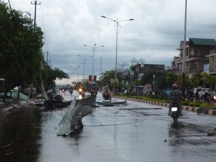 We sat there for sometime, the corrugated roof not giving that much shelter but enough from getting drenched. We bought a plastic poncho feeling we should give the shop owner some custom for giving us shelter. When the rain eased we got back on the road but again the rain had a second wind and came down extremely heavily. This time we sheltered with some other people all under a thin long corrugated steel roof extruding from a garage. When the locals started to make a move so did we. Not far down the road we saw the carnage unveil itself. The wind and rain had been so strong it had brought down electric cables in to the main road,corrugated steel roof had been flung into trees and littered the road.