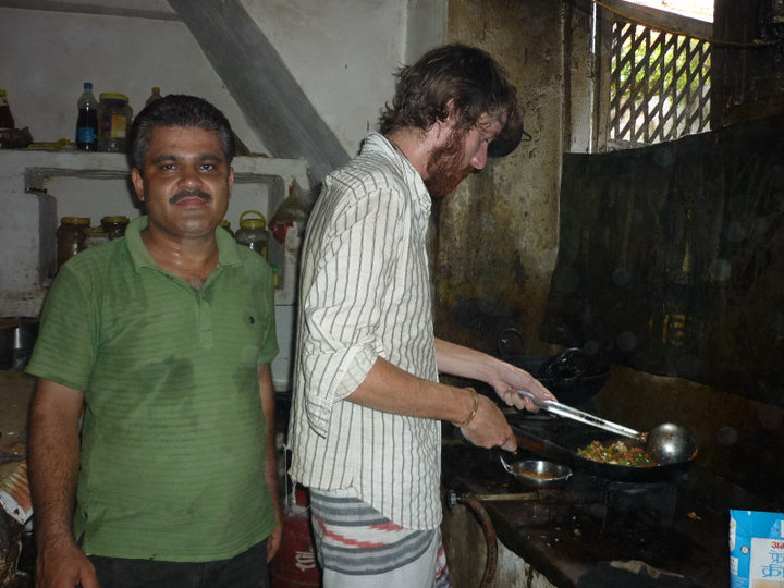 It become apparent early on that we are really going to have to push him to give us a satisfactory lesson. I am constantly asking him questions and drilling him on his 'knowledge'. We spend the first hour of our 2hr lesson sat at a table as he explains how to cook Cheese Kofta, Vegetable Jal Frazy and Missi Roti. At one point he was drawing pictures of carrots and tomatoes. Laura was concentrating more at keeping a straight face than how to make bases to the curry dishes! Anyway, we finally got into the kitchen. It was what you would expect of an Indian restaurant kitchen. FILTHY. FLIES. Spring to mind. We put on out aprons and filth goggles and get down to business. Oh. he has prepared almost everything already. So the lesson was pretty quick and as he only has one stove we had to leave each dish on the side going cool as we cooked the next one. All in all, it wasn't the best lesson in the world, but we did pick up some good tips and learn what goes into the base of most curry dishes- something we experiment with back in the UK. Unfortunately, down the line it transpired that Laura also picked up a stomach upset from our lesson too.....but that is another story.