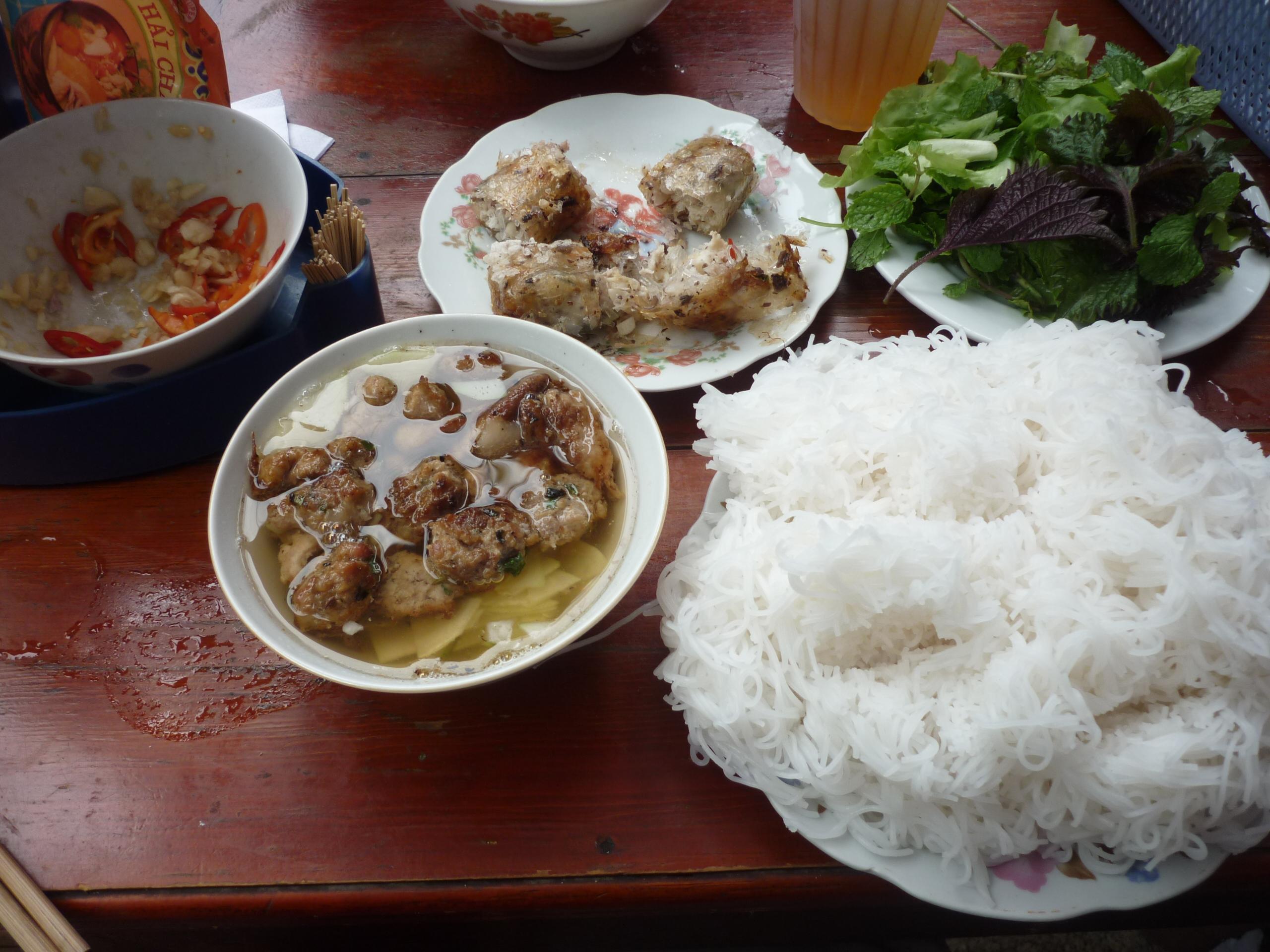 You need the butcher to give you offcuts of beef bones, beef brisket (tendon and low quality stewing beef), onion, ginger, star anise, and cinnamon. The onion needs to be fried at a fairly high heat so that it takes on a brown colour. This adds a burnt caramel flavour and brown colour to the dish. This is all simmered with around 2 litres of water on a low heat for 6-8 hours, although some restaurants cook it over at least 24hrs in massive vats. The fat is skimmed off to reveal the tastiest broth you are likely to experience anywhere. It makes Vietnam famous in food. Garnish the pho with finely sliced white onion, the green end of spring onion, corriander, and thorny coriander (ngo gai) A side dish of bean sprouts, lime, chili peppers, peanuts and basil is important and makes the fresh part of the dish. For more on this dish you can check out our book, which contains more information.Bún cha