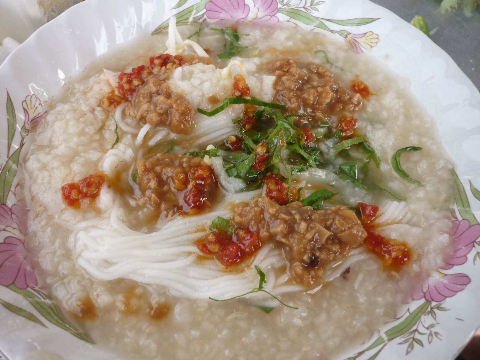 Savoury porridge was seemingly only really popular during the morning hours as a warming dish for the day. Similar to Congee from Hong Kong it can be made with fish or meat, but definitely with spring onion and fish sauce. The dish was designed to use up "few day old rice" as wastage in Cambodia was never an option.