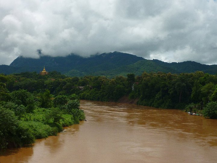 Another afternoon on the bikes we chose to visit some of the temples that dotted the maps of Luang Prabang. We stumbled upon a beautiful one ontop of a hill that overlooked the town. A quiet place wth a look out point. We were lucky enough to be blessed by an elderly woman monk, funnily the first time in all of our travels that it had actually happened. With blue skies and a blazing sun we enjoyed the view of the town full of trees it was hard to believe it was the second biggest town in the country. In the horizon other hills glistened with temple tops gleaming in the distance. After we sped down the smooth steep tarmac road shaded by broad old trees. We didn't really have an aim or direction but found ourselves out of town at the Mekong on a dirt road. We could see where town was so chose to continue on the dirt road hoping to come out at a bridge. The dirt road got bumpier and bumpier, our bikes rattled and it became so hot and humid we were really hoping to reach a smoother road soon. The bridge we finally came to was being constructed so we were lucky that it was stable enough for us to walk across with our bikes. By this time we had mud all up our legs and we were feeling hot, sticky and rather tired from the heat. Just as we were preparing ourselves for the cycle back into town we noticed a sign to