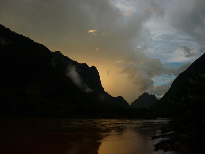 and mud adorned the outside environment as it started to spit with rain, black clouds rapidly flowing over the mountain peaks like a dolphin through water. The inside of the bungalow was well appointed as it was actually clad with plaster board, an effort usually too great for the Laotians. The bathroom was tiled and with a hammock outside on the verandah we were extremely happy. We also felt luck as our expenses were covered and so we were heading to a place that we otherwise could not have reached with our budget restrictions. We had agreed that we would really push ourselves off the beaten track and do something that challenged us to the limits and here we were, we were doing it. Anticipating excitement rushed through us as we sat taking in the scene. After a needed nap we headed over to grab something to eat from a restaurant that looked over the river and the port, which we would be stood at tomorrow to pick up a public boat to Muang Ngoi. For now however we ate well; pizza bread, noodle soup, Aurlam (a local dish made of meat, dill and wild mushrooms), fried rice and local coffee formed the veritable spread we needed with lack off food the night before and breakfast. The view was impressive as the clouds rolled in and dissipated, sun beams highlighted different parts of the landscape in ways artists dream of. The river was exceptionally high and the boats roared into life and cut across the river to begin its crawl upstream on the near side of the bank.