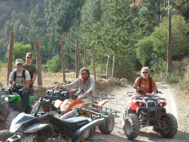 though were a different matter, the potholes and dusty conditions make it a little more challenging. If you are behind someone then seeing is difficult. No wonder the bikers like it to have rained here before they go out, so the path is mud and not dust. Either way it took us all a while to get going, we headed in convoy making a lot of noise and were a sight to the locals who had not often seen westerners, let alone those ripping around on quads! We made our way up into the mountains when suddenyl we looked around and had lost a team member. I headed back to see where he was and no sign. Everyone coverged back in one spot and were all confused. Where could he have gone? Another guy headed back and found him. His chain had come off. We ended up heading back as the road further on had been washed out and so headed back to Pumamarker for the second time, but this time we were driving up the potholed road, scarred by irrigation channels the locals had made to direct the run off water to their crops. After an hour of bone rattling and the chains continually coming off as a result of the rocky ride we were getting little frustrated, but after a while got a system of putting the chains back on easily. That was a good thing, as the tour company with the bikes laughed at the predicament. "So you fixed it? Great!". Thanks guys. We made it to the final bridge where we had to navigate the bikes across a few tree stumps across the river before Laura's motor finally conked out and wouldn't restart. So we walked the rest of the way and had a well deserved smoke at the top, enjoying the scenery once again from the summit. The rest, as they say, was downhill, and we crused back at pace powersliding around the hairpin bends as dusk began to approach. What a ride! All the hard work of cycling eliminated and a real rush. We headed back to Apu Lodge and had a few beers before calling it a night.