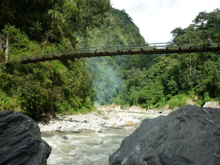 Our final decent was negotiating 5 rocks that were balanced across another steep drop into nothingness, these wobbled alarmingly as we hald onto each other, but finally charged through, incurring more stings and cuts. the river was no longer the peaceful thing we were daydreaming to previously, but completely not made for swimming in. Pools created by massive rocks generated by landslides were welcoming. Laura jumped into the side stream and instantly sank to her knees- she was still sinking. It was quicksand. Laura pulled herself out the other side and I jumped in arse first to spread my weight before climbing up onto the rocks on the other side. We knew that water tricking through rock is clean at the top of the hill and less so at the bottom, due to the increasing number of potential pollutants, but we had no option and filled the bottle with water. We sat in the pool with weight spread half onto the edge of the quicksand pool to cool off in the fresh water. I washed my underwear and sat naked for an hour in the sun. A beautiful moment to be cool and clean at the same time after being drenched in sweat. It is great to be reminded what nature can give you if you are prepared to take it.