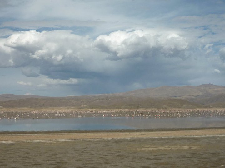 journey, were incredible. We zoomed past a massive lake called Lake Poopo. It was home to a huge population of wild Andean Flamingos. It was the first time Al and I had seen these wild birds, and looking out of the window really was captivating. After the lake, the landscape returned to barren and empty with mountains of the horizon. Captivating in its own right, but after a couple of hours of it, I was glad to have a good film to watch and pass the time.